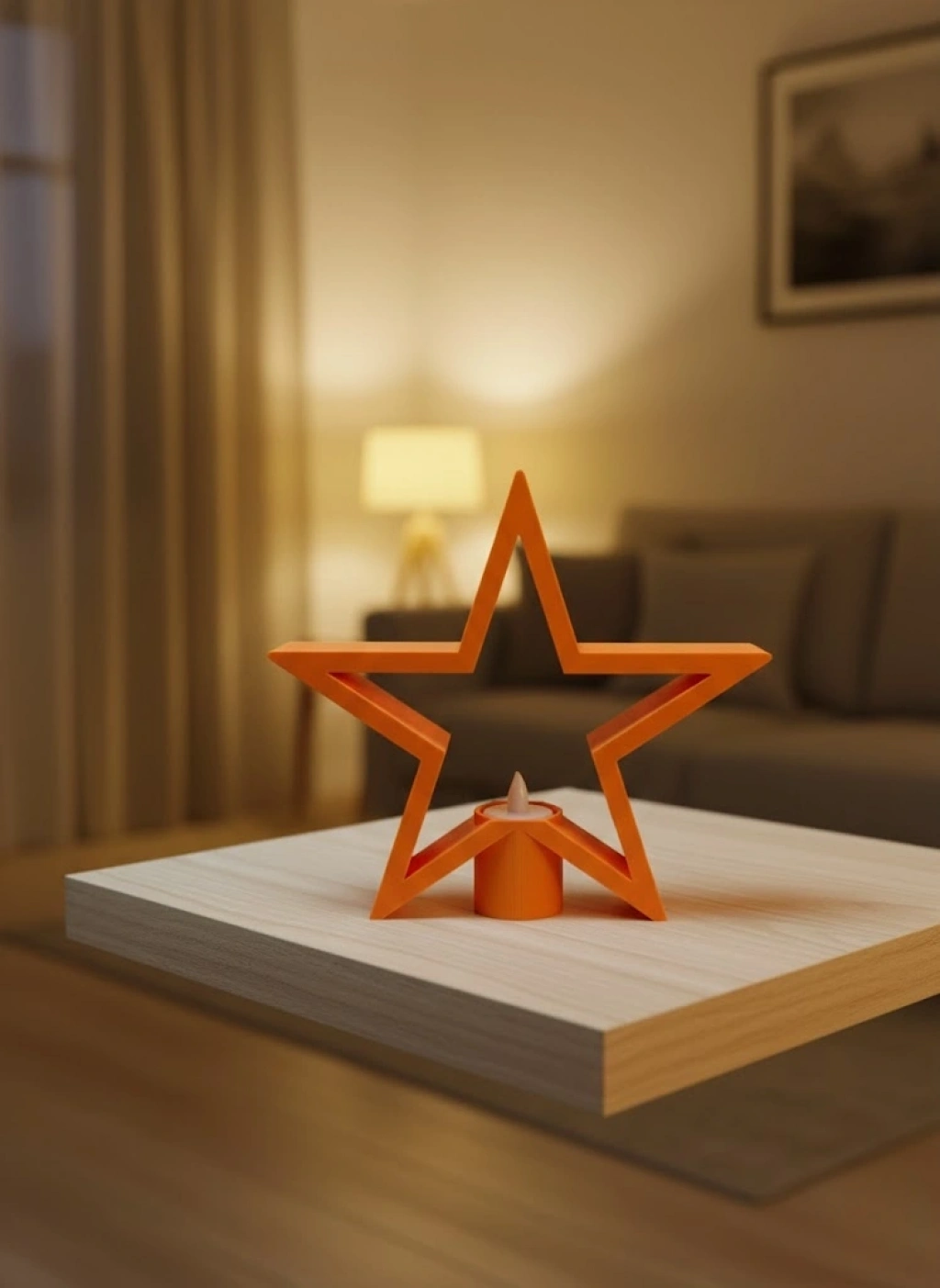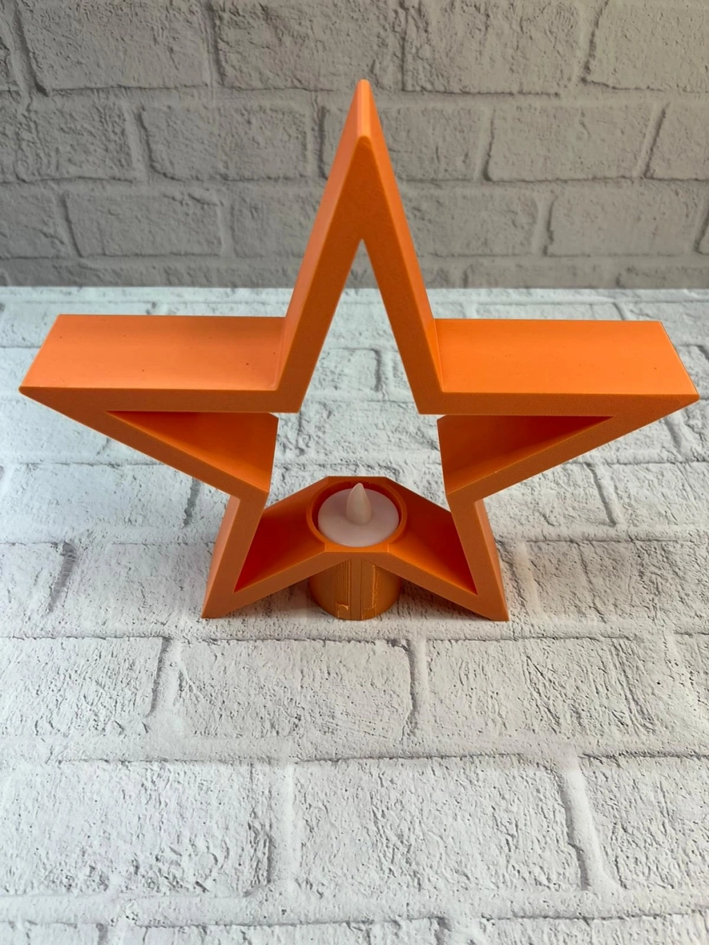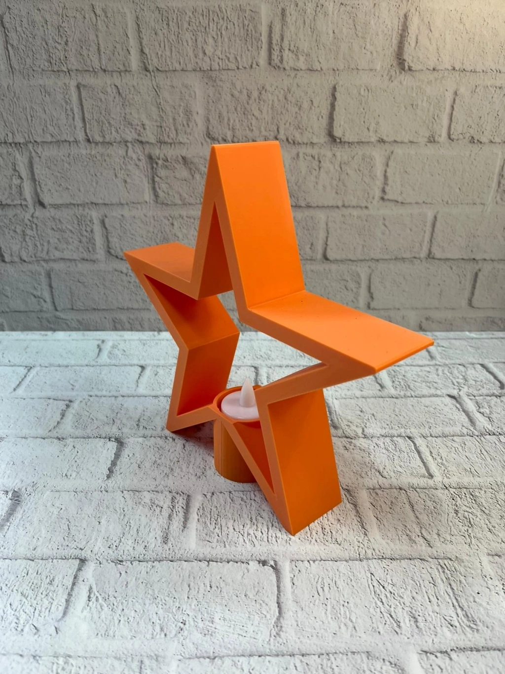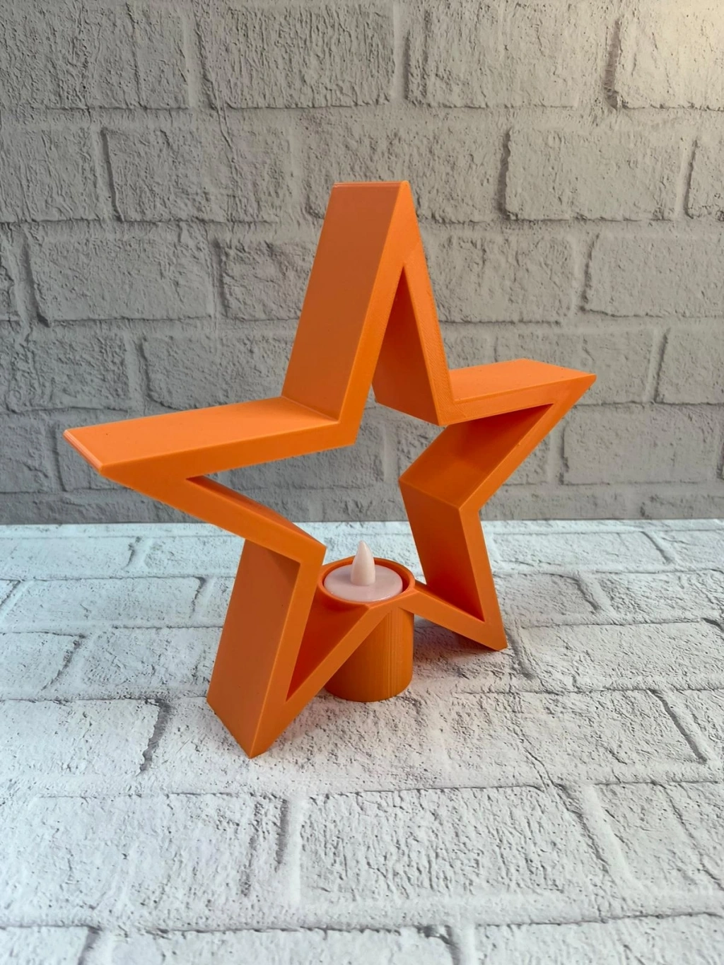 Turuncu yıldız mumluk, sıcak ve enerjik rengiyle yaşam alanlarına samimi bir atmosfer kazandırır. 21×23 cm ölçüsü sayesinde raf, masa, şifonyer veya TV ünitesi üzerinde dengeli ve şık bir duruş sergiler. Mum ışığıyla birlikte loş ve huzurlu bir aydınlatma sunarak salon dekorasyonunu tamamlar. Modern ve cozy tarz sevenler için ideal bir dekoratif aksesuardır.