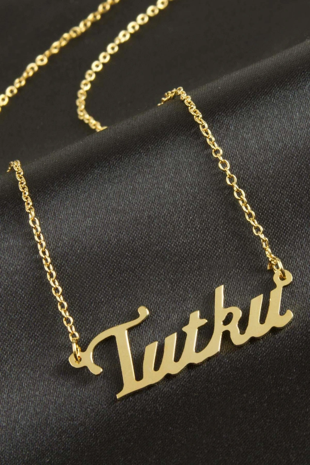 Tutku isimli kolye. İsimli kolye pirinç madeninden ve altın kaplamalıdır. Kişiye özel üretilmektedir.Yazdırmak istediğiniz ismi bize mesaj olarak iletmeniz gerekmektedir. Kullanıma bağlı olarak uzun süre kullanıma uygundur. Ürün malzemesi 1.sınıf kalitededir. Ürün ve zinciri sarı renktedir. Ürün zincir boyu 45 cm ve ürün üzerindeki isimler yaklaşık 3 cmdir. İsim boyları ürün ismine göre degişiklik göstermektedir.