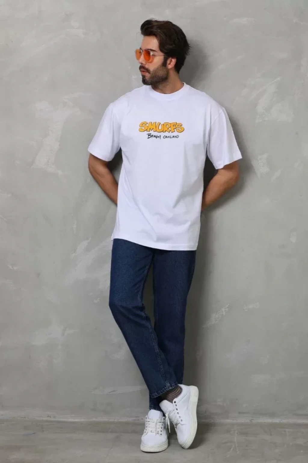 Unisex Bisiklet Yaka Baskılı Oversize TShirt Beyaz