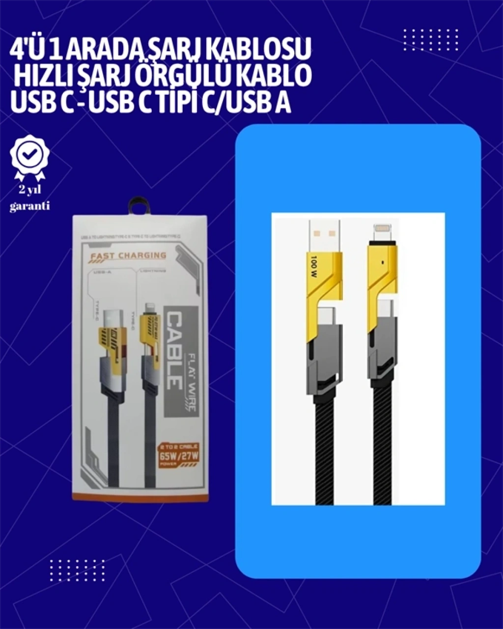4’ü 1 arada hızlı şarj kablosu, USB A - USB C, USB C - USB C, USB A - Lightning ve USB C - Lightning bağlantılarını destekleyerek iPhone, Android, iPad ve MacBook gibi çok sayıda cihazla uyumlu çalışır. Maksimum 65W çıkış gücü ve 27W’a kadar iPhone uyumlu hızlı şarj desteği sunar. Kablo, 30 dakikada %50’ye kadar dolum yapabilir. Kararlı voltaj çıkışı ve akıllı koruma teknolojisi ile cihazlarınız güvende kalır. Yüksek esneklikli örgülü dış kaplama, hem lığı önler hem de aşınmaya karşı dayanıklılık sağlar. Uzun ömürlü, hafif ve taşınabilir yapısıyla gün boyu bağlantıda kalmanız için ideal bir çözümdür.