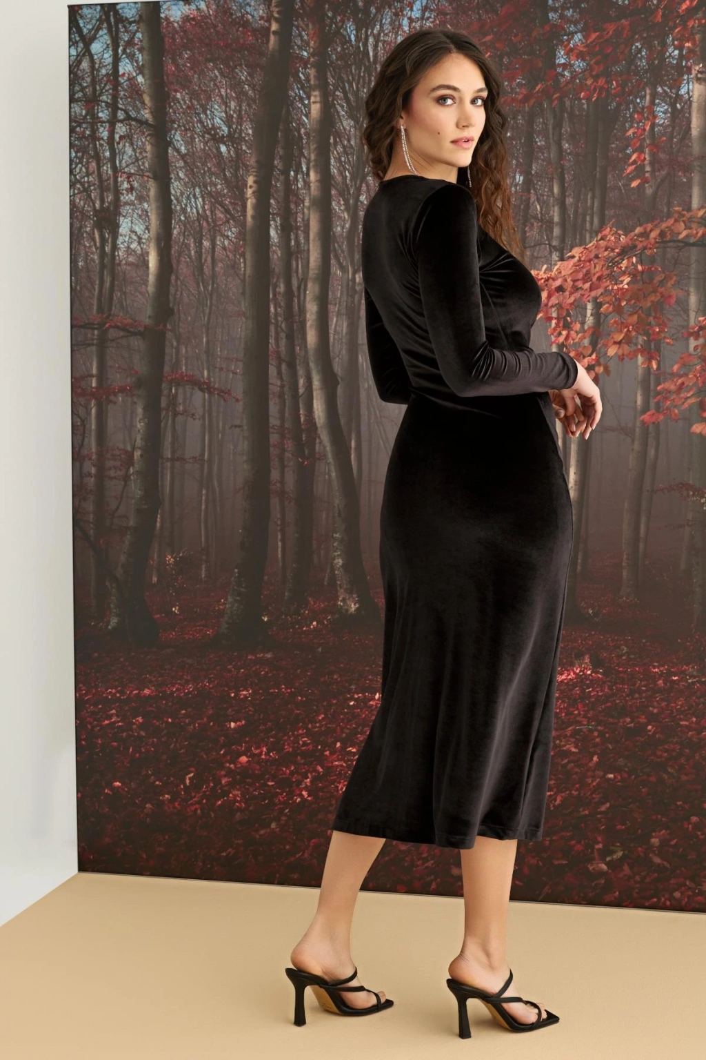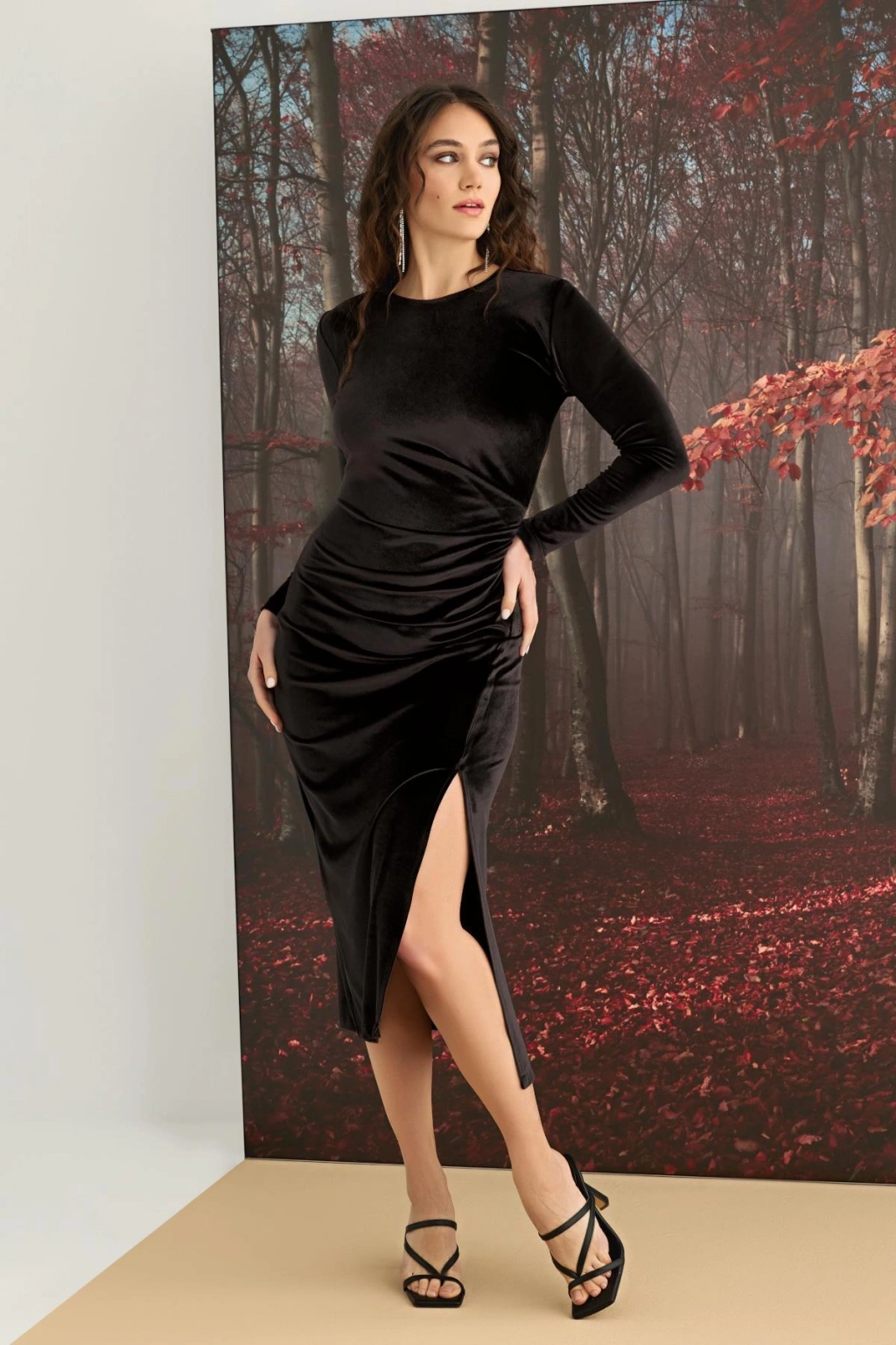 MARSiLYAN- Uzun Kollu Yırtmaçlı Kadife Elbise