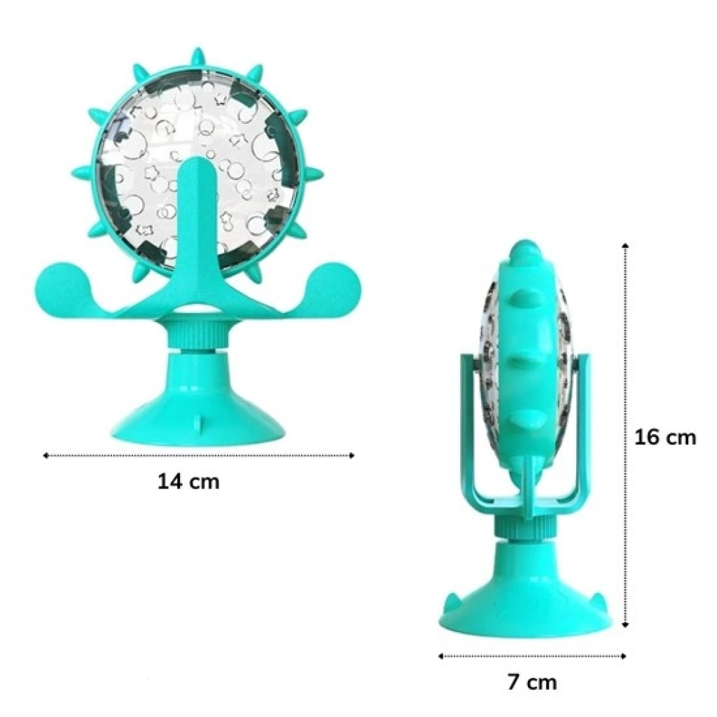 Tekerlekli Dönebilen Oyuncak değirmen şeklindeki tasarım, kedinin tekerleği hafif bir itmesiyle 360 derece dönmesini sağlar. Oyuncak dönerken durdurabilir. Üst tarafında bulunan yumuşak tıpayı çıkararak içine kedi maması ya da atıştırmalık ekleyebilirsiniz.