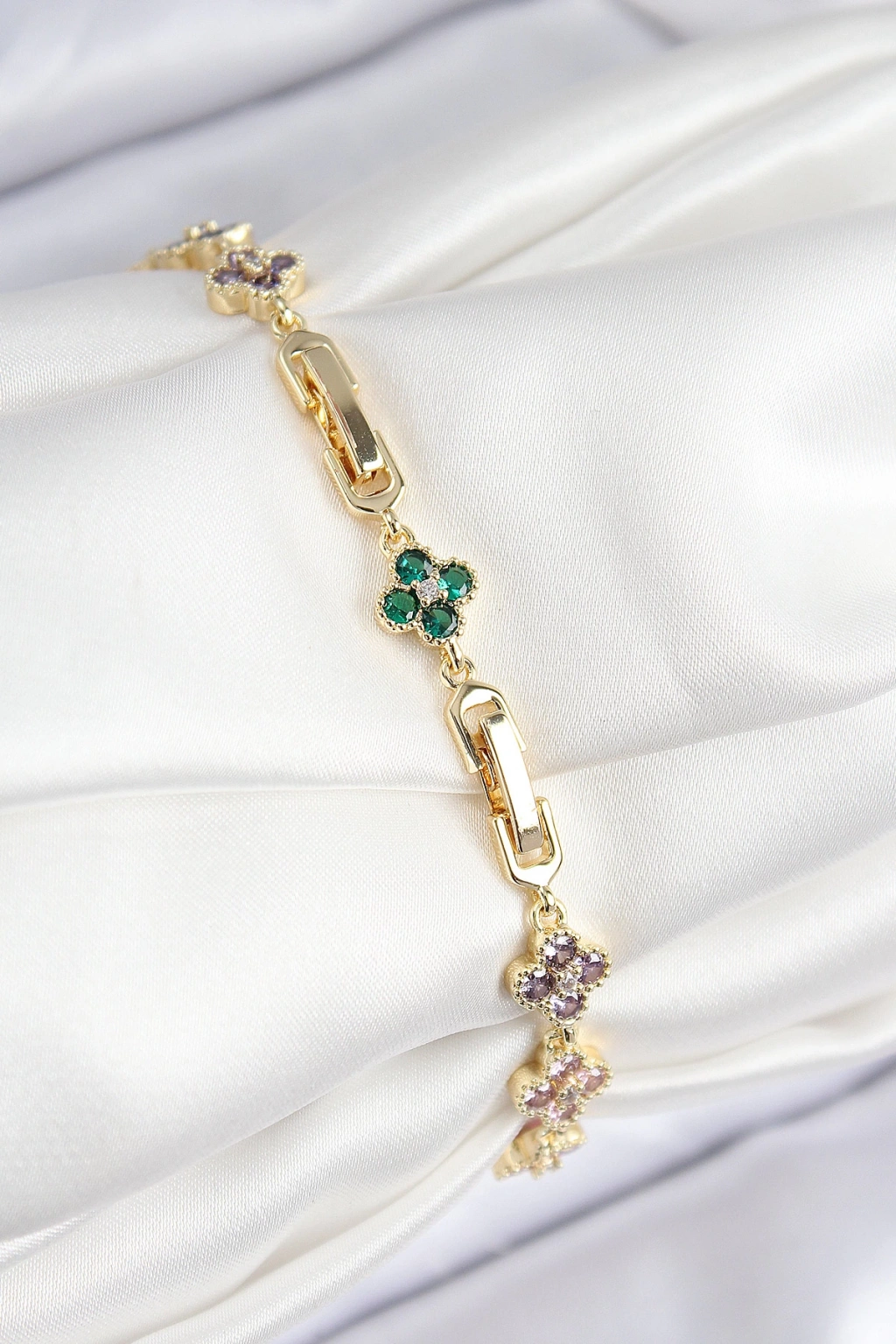 VIP Pirinç Renkli Zirkon Taşlı Yonca Model Gold Renk Kadın Bileklik - TJ-BB7781