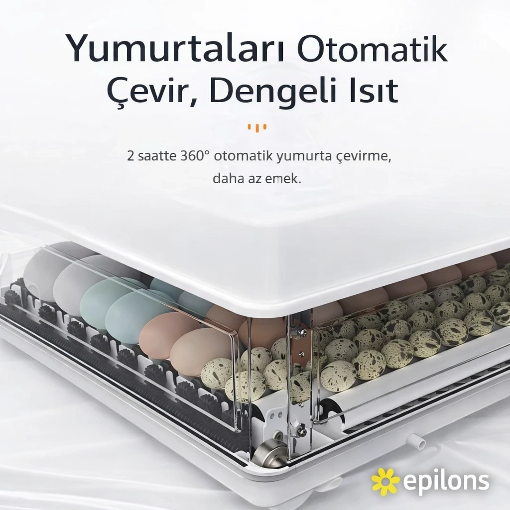Makine, yumurtaları 2 saatte bir 360° otomatik çevirme özelliği ile dengeli şekilde döndürür. Bu sayede embriyo gelişimi homojen olur, çıkım oranı yükselir ve manuel müdahaleye gerek kalmaz. Isı dağılımı eşit yapılır, yumurtalar her noktada aynı sıcaklığı alır.