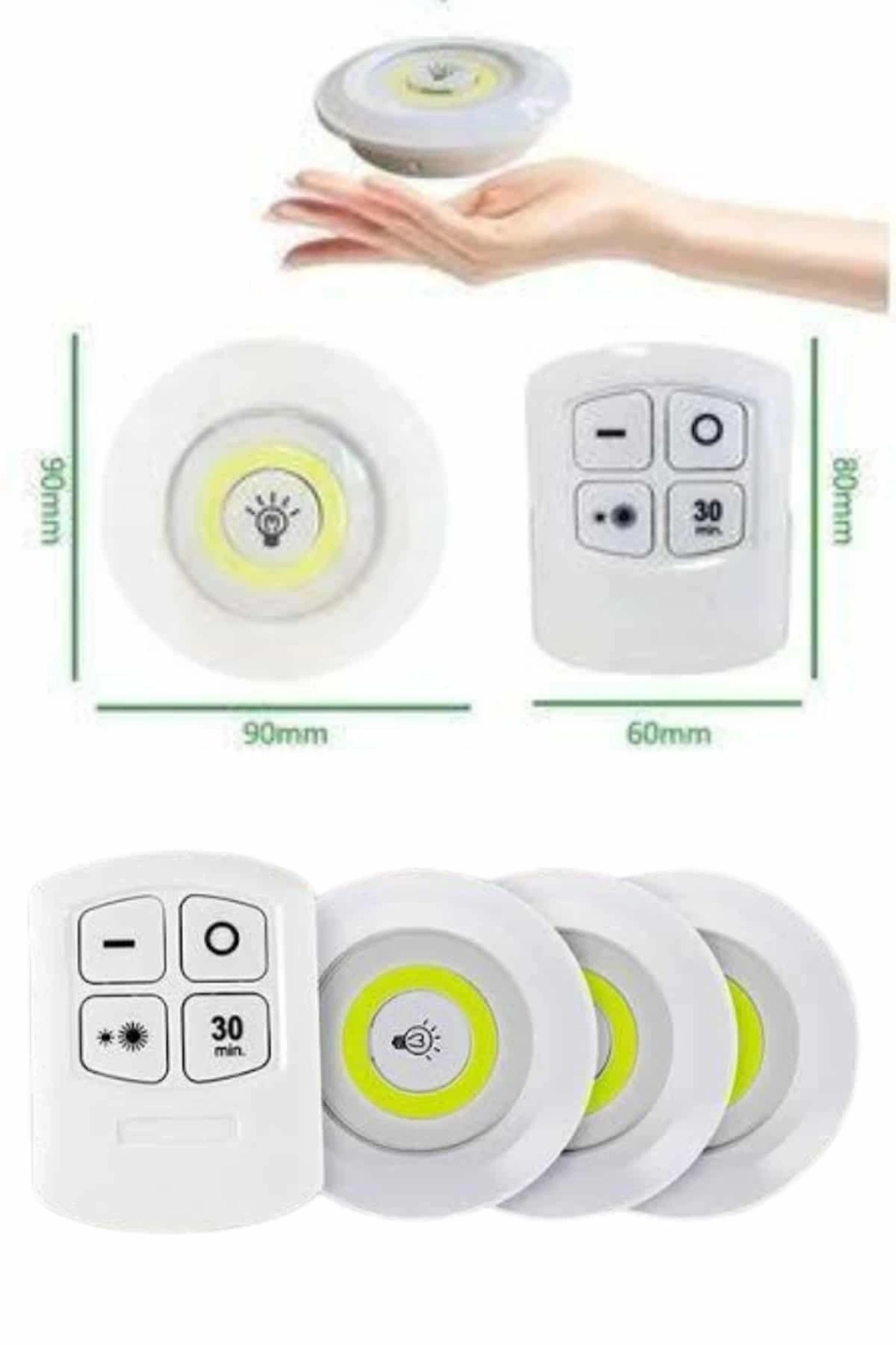 Kumandalı Kablosuz LED Spot Işık Seti – 3'lü Paket | Ayarlanabilir Parlaklık, Zamanlayıcı, Kolay KurulumEvinizde aydınlatma ihtiyaçlarınıza pratik ve es bir çözüm arıyorsanız, bu kablosuz LED spot ışık seti tam size göre. Modern tasarımı ve işlevsel özellikleriyle dikkat çeken bu ürün; banyo, mutfak, gardırop, merdiven altı, kitaplık ve daha birçok noktada ideal bir yardımcı olarak öne çıkar. Minimal boyutları sayesinde fazla yer kaplamaz, ancak COB LED teknolojisi sayesinde etkili ve yeterli bir aydınlatma sağlar.Set içerisinde yer alan 3 adet spot lamba, pille çalıştığından kablo karmaşası yaratmaz ve elektrik bağlantısı olmayan alanlarda da rahatlıkla kullanılabilir. Her biri 3 adet AAA pil ile çalışır (piller pakete dahil değildir). Uzaktan kontrol imkanı sunan akıllı kumandasıyla ışıkların parlaklığını dilediğiniz seviyeye getirebilir, açma-kapama işlemlerini mesafe fark etmeksizin gerçekleştirebilir ve 30 dakikalık zamanlayıcı kurarak ışıkların otomatik olarak kapanmasını sağlayabilirsiniz. Ayrıca her spotun üzerinde bulunan tuşlarla manuel kullanım da mümkündür.Kumandayı sürekli el altında tutmak isteyen kullanıcılar için özel bir duvar atı da set içerisinde yer alır. Bu atı dilediğiniz düz yüzeye sabitleyerek kumandanızı kaybetme riskini ortadan kaldırabilirsiniz. Montaj işlemi son derece basittir; güçlü çift taraflı yapışkan bantlar sayesinde vidalama veya delme işlemlerine gerek kalmadan ürünleri kolayca monte edebilirsiniz.Ev dekorasyonuna zarif bir dokunuş katan bu LED spot seti, kullanıcı dostu özellikleri ve yüksek performansıyla yaşam alanlarınıza hem es hem de fonksiyonel bir katkı sunar.