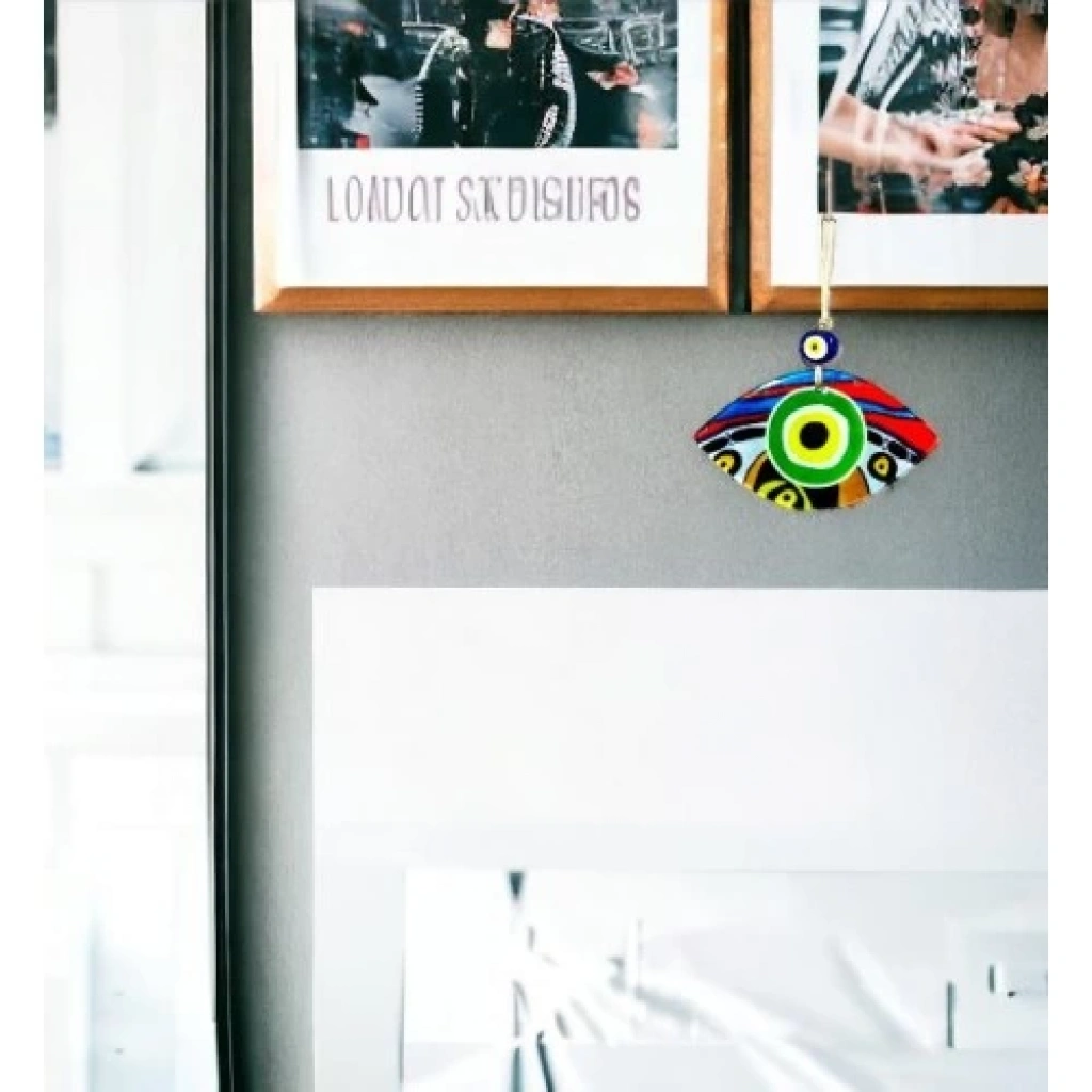 Yeşil göz modelli duvar süsümüz 15 cm eninde, 8 cm boyundadır. Füzyon cam malzeme kullanılarak üretilen duvar süsümüz ip dahil 23 cm boyundadır.
