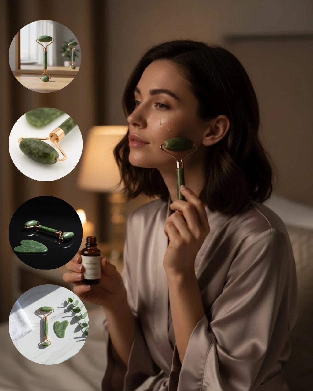 2 parça jade stone yüz bakım seti, şişkinlik görünümünü azaltmaya yardımcı olur ve cilt bakım ürünlerinin emilimini destekler.Günlük kullanıma uygundur ve ergonomik tasarımı sayesinde konfor sağlar.