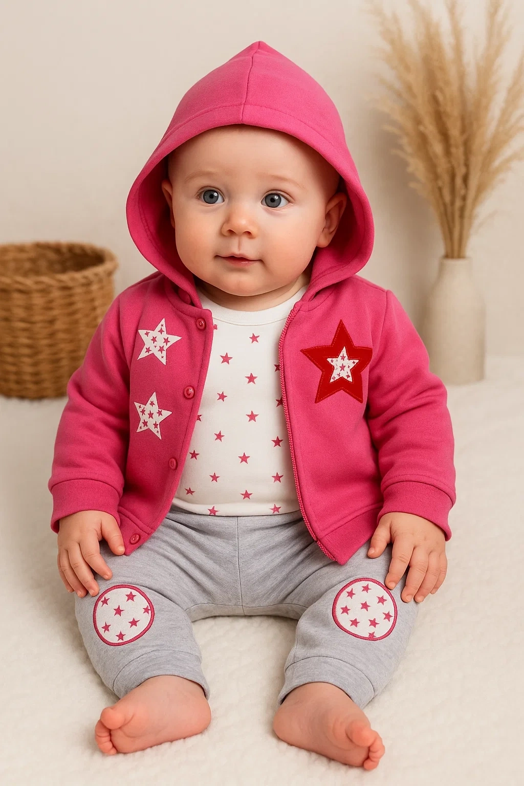 Yıldız Nakışlı Kapişonlu Kız Bebek Takımı