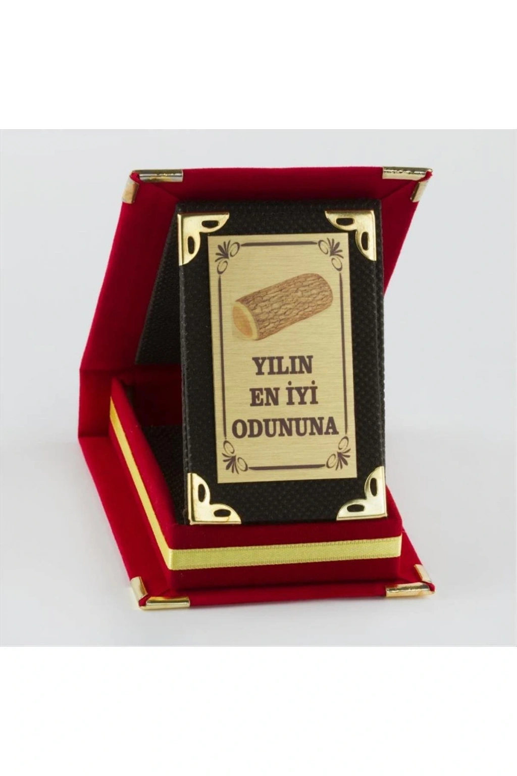 Süet kutulu plaket, metal üzerine yazı yazılarak üretilmiştir, ölçüleri kurulu vaziyette; yükseklik: 11cm, genişlik: 8cm'dir.