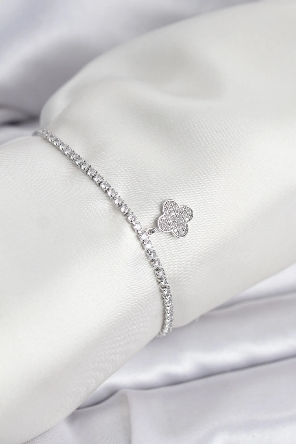 Yonca Model Zirkon Taşlı Gümüş Renk Asansörlü Su Yolu Bileklik - TJ-BB8243