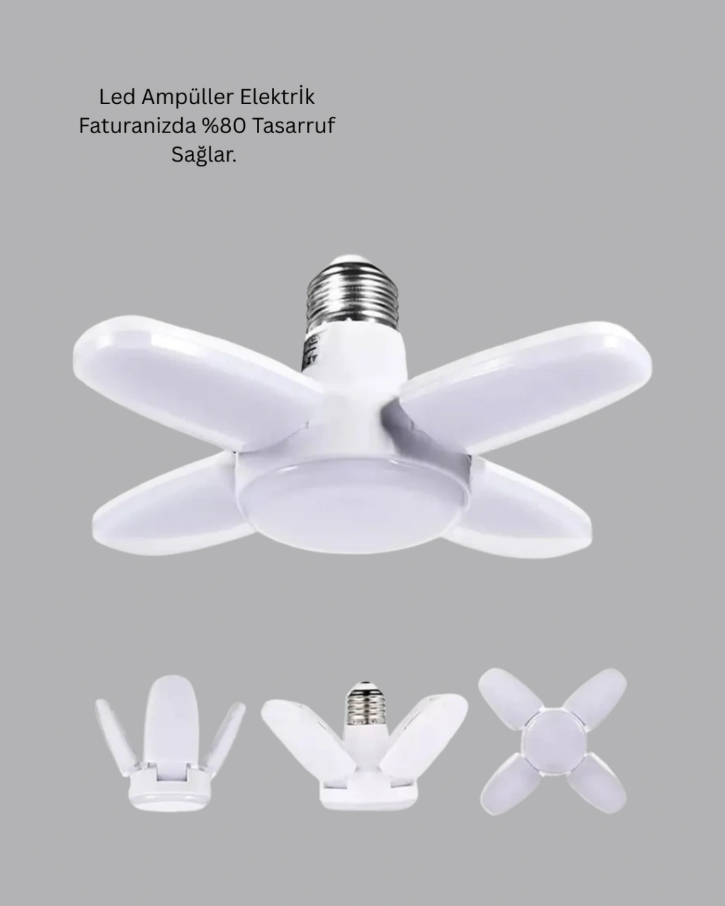 Enerji tasarruflu 4 kollu katlanır pervane LED ampül, yüksek ışık gücü ile maksimum performans sunar. 6000 lumen aydınlatma kapasitesi, karanlık alanları saniyeler içinde aydınlatırken beyaz ışık rengi net ve doğal bir görüş sağlar.LED teknolojisi, düşük enerji tüketimi ile çevre dostu bir kullanım sunar ve elektrik faturasında ciddi tasarruf sağlar. 60 Watt gücüyle klasik yüksek wattlı ampullerin yerini rahatlıkla alır. Katlanabilir kolları sayesinde ışık dağılımı dengeli ve geniş açılıdır.Kolay montaj özelliği sayesinde ekstra tesisat gerektirmez. Dayanıklı malzemesi uzun süreli kullanım için uygundur. Ev, ofis, depo ve ticari alanlarda güvenle tercih edilebilir.