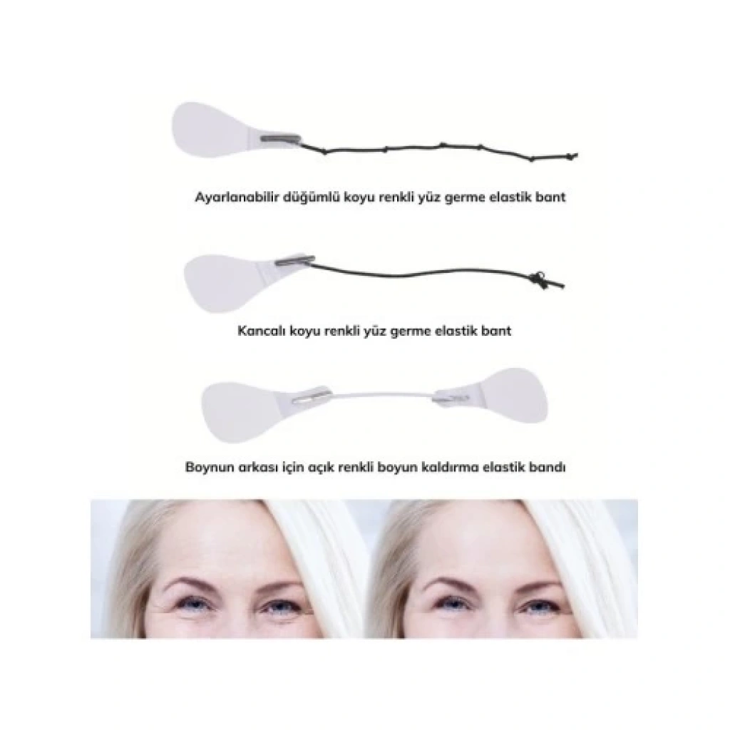 Lastikli Yüz Kaş Göz Boyun Gerdirme Bantları (40 Adet)Ürün Özellikleri:V Şekilli Bir Yüz için: Yüz germe pedleri, iyi esnekliğe sahip su geçirmezdir ve cildinizi rahatsız etmez. V şeklinde bir yüz oluşturmak için cildinizi kaldırabilir ve sıkılaştırabilir.Yumuşak ve Rahat: 40 adet hipoalerjenik yüz germe bantları vardır ve bunlar çevre dostu silikon kauçuk malzemelerden yapılmıştır, kullanımı güvenlidir, sağlıklı, yumuşak ve rahattır.Mükemmel Yüz Germe: Yüz ve boyun germe seti, gevşek cildi iyileştirir ve yüz, boyun, çene ve göz bölgesindeki kırışıklıkları ortadan kaldırır.Daha Genç Olun: Yüz germe bandı, sarkan yüz kaslarını germeye yardımcı ve yüzünüzü şekillendirmeye yardımcıdır. İlk kullanımla beraber daha genç görünecek ve harika hissedeceksiniz.Geniş Uygulamalar: Yüz germe bandı özel günler, düğünler, toplantılar, modellik, fotoğraf çekimi, seyahat vb. için idealdir. İnce, sıkı ve güzel bir yüzün şekillendirilmesine yardımcı olur.Malzeme: Silikon,kauçukRenk: şeffafPaket İçeriği:40 adet Yüz Germe Bandı ve Kademeli Uygulama Lastikleri