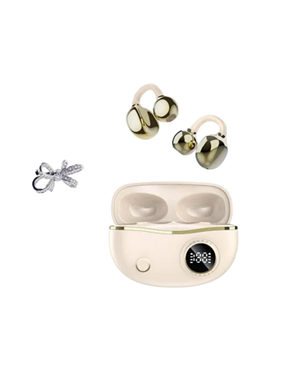 Bu kulak klipsli Bluetooth kulaklık, fonksiyonellik ve estetiği bir araya getirir. Eller serbest kullanım sunan yapısı, günlük hayatı kolaylaştırır. Kompakt tasarımı sayesinde her ortamda rahatça taşınabilir.Uzun pil ömrü, net ses performansı ve zarif tasarımıyla öne çıkar. 2 kurdele küpe hediyeli set içeriği sayesinde şık ve kullanışlı bir hediye seçeneği sunar.