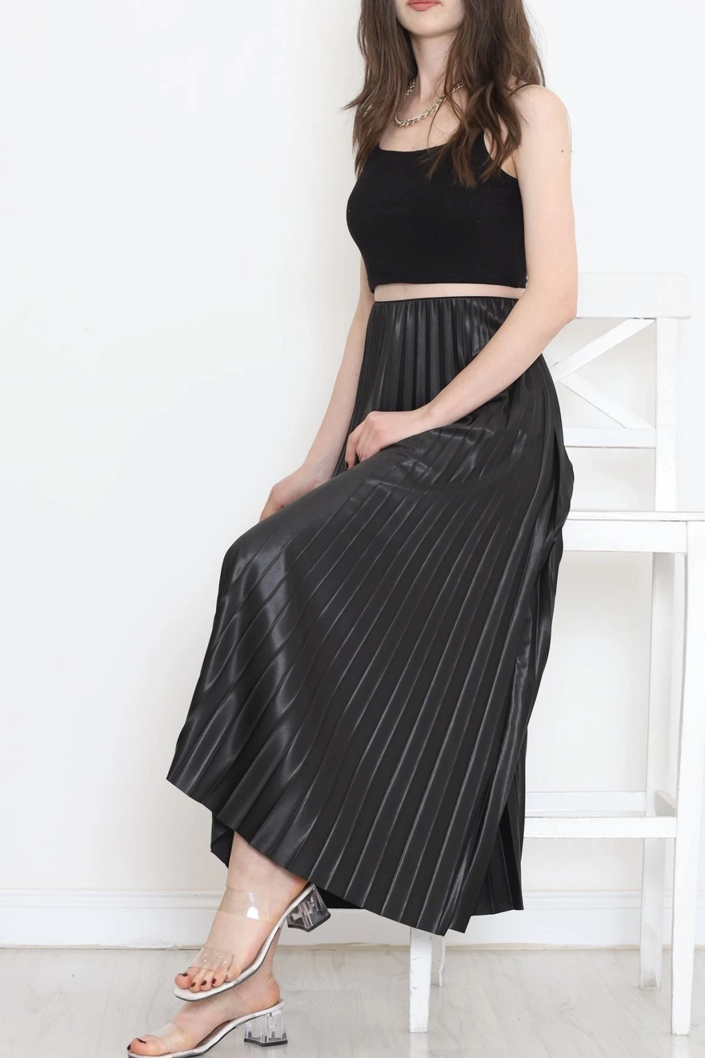 -Pileli parlak krep gizli lastikli siyah etek, şıklığı ve rahatlığı bir araya getiren özel bir giyim parçasıdır. Modern tasarımıyla dikkat çeken bu etek, hem zarif hem de kullanışlıdır.