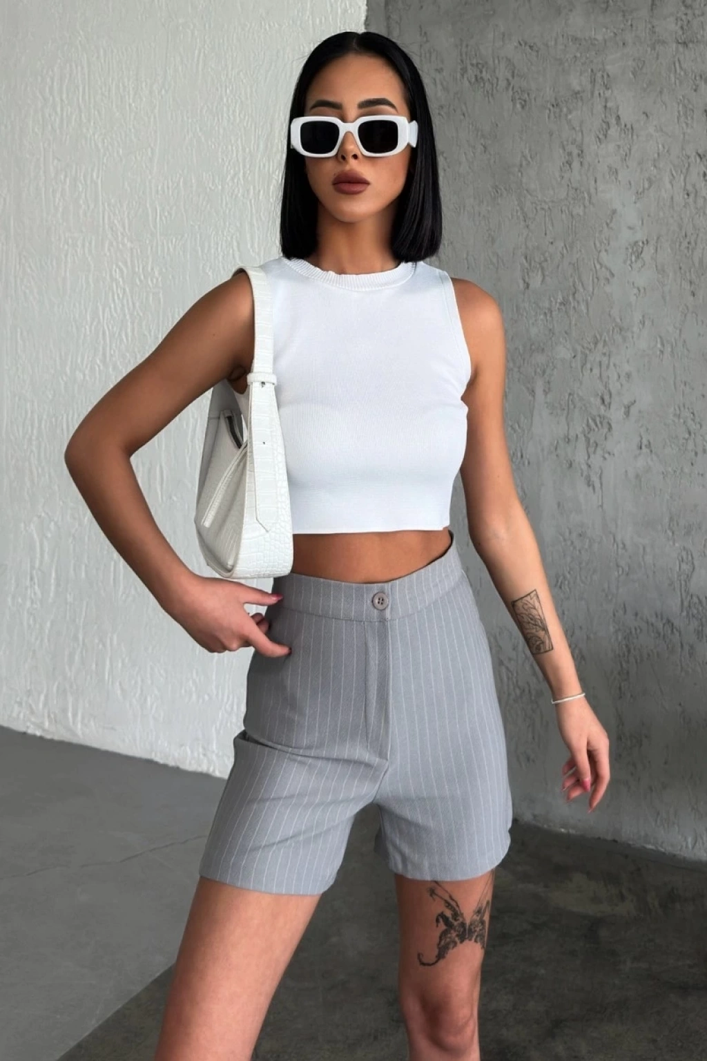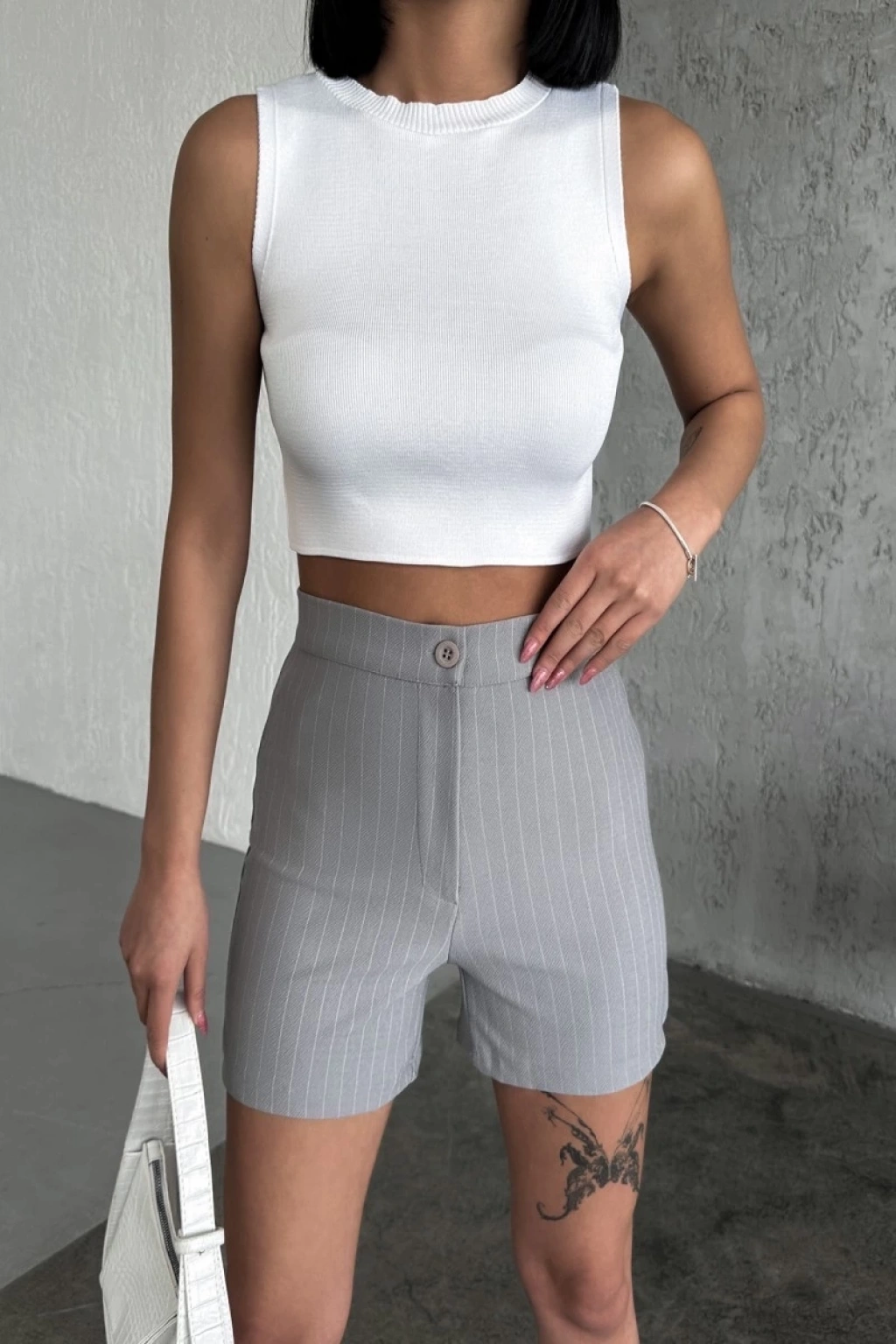 -Bu şık yüksek bel krep çımalı çizgili şort, gri tonuyla zamansız bir şıklık sunuyor. Esnek likralı kumaşı ve şık tasarımıyla hem rahatlık hem de tarz arayanların favorisi olmaya aday.