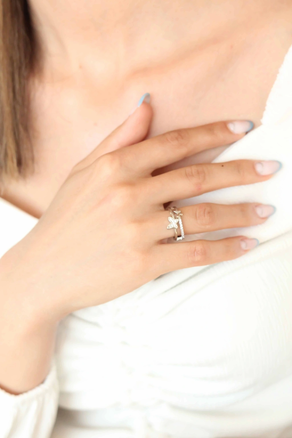 Zirkon Taşlı Gümüş Kaplama Kelebekli Kadın Yüzük - TJ-BYK2320