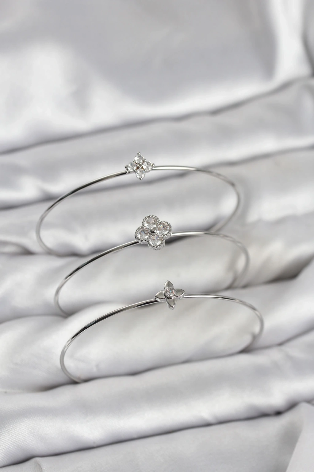 Zirkon Taşlı Gümüş Renk Yonca Tasarım 3'lü Kadın Bileklik Kombini - TJ-BB8352