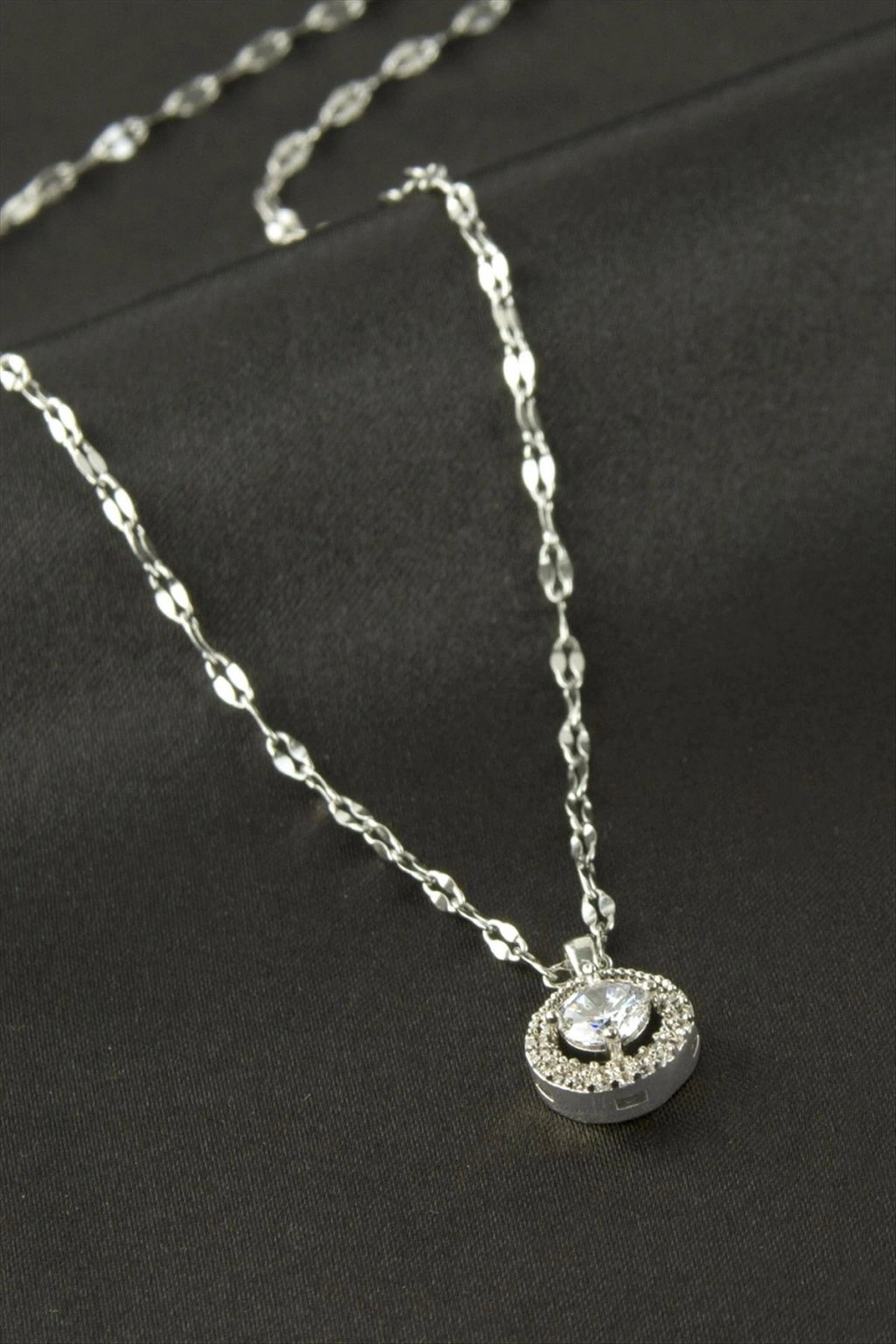 Kolye; Ürün malzemesi metal ve zirkon taşlıdır. Ürün boyu 45 cmdir. Kartlıdır. 1 sınıf kaliteli malzemeden üretilmiştir. Ürün ucundaki aparat boyu 1 cmdir.