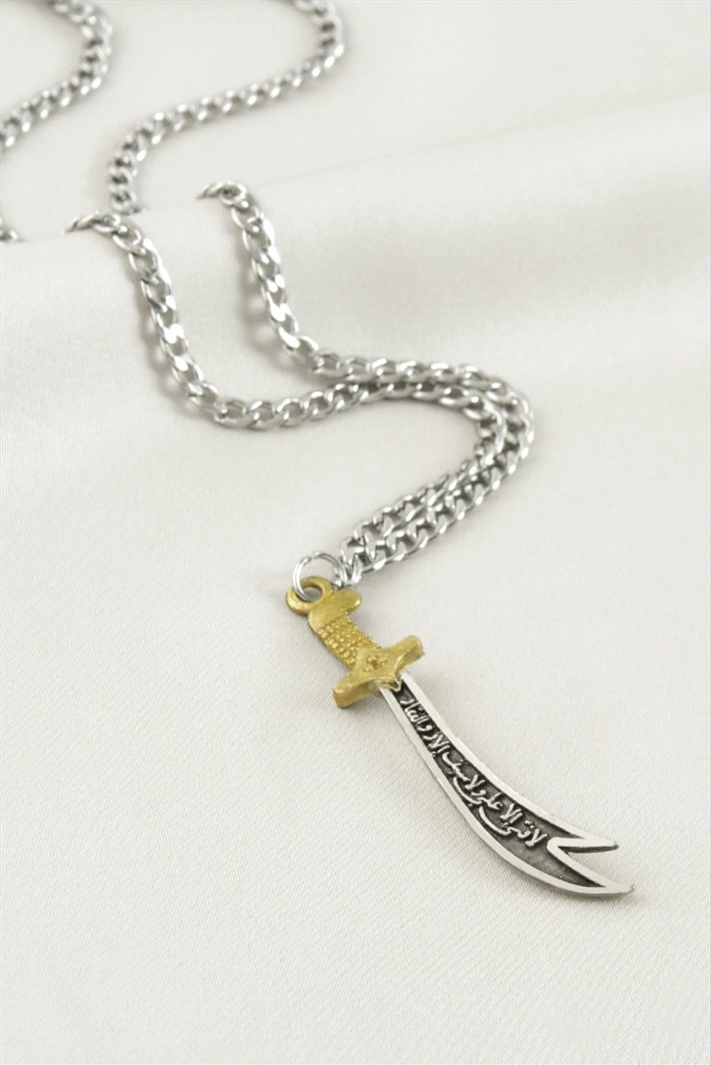 Kolye; Ürün malzemesi çelik ve bronz kaplamalıdır. Ürün zincir bölümü çelik ve kılıç bölümü bronzdur. Zincir uzunluğu 55 cm ve kılıç uzunluğu 4,5 cmdir. Kartlı ve paketiyle beraber gönderilecektir.