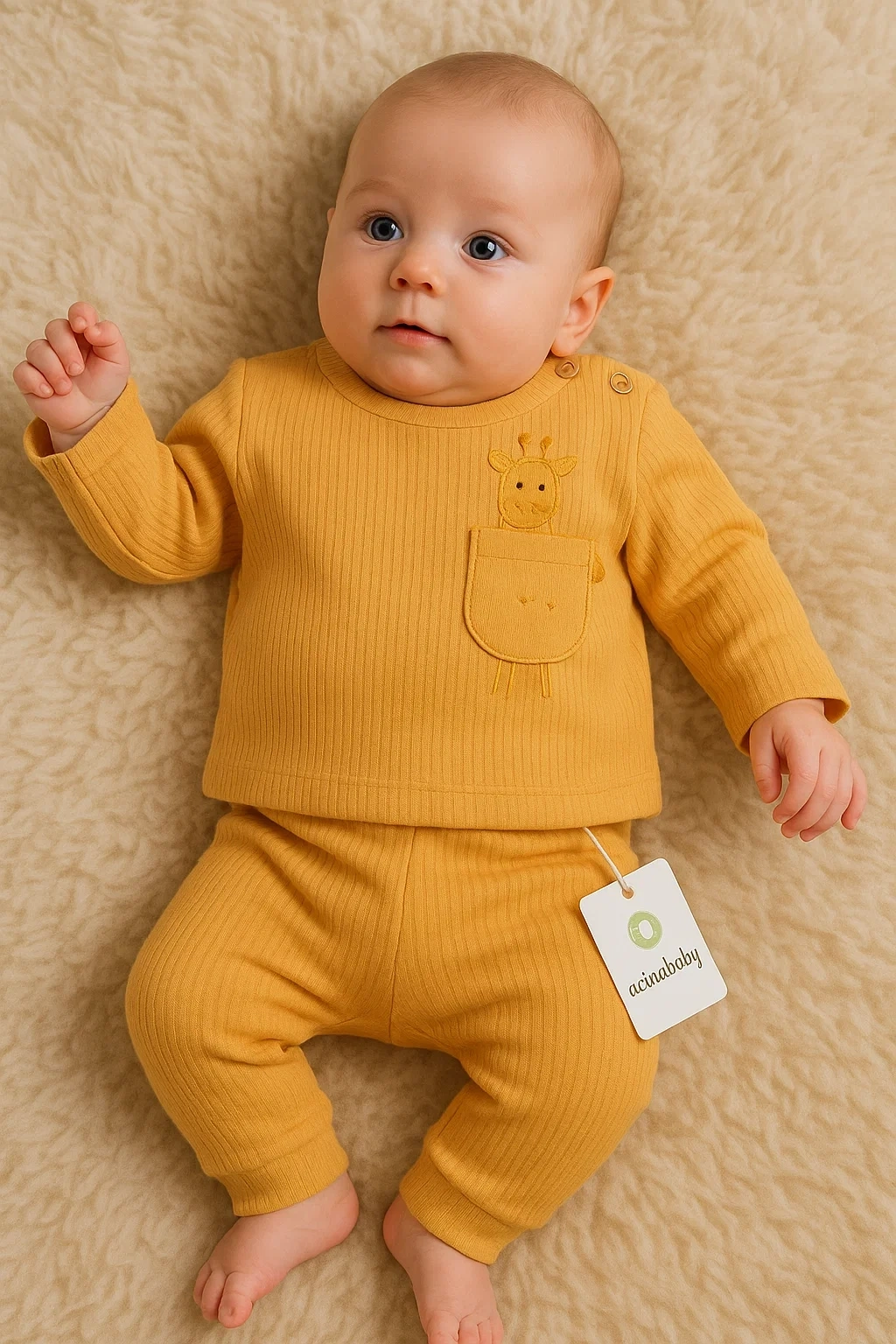 Zürafa Cep Nakışlı Omuzdan Düğmeli % 100 Pamuk Erkek Bebek Takım.